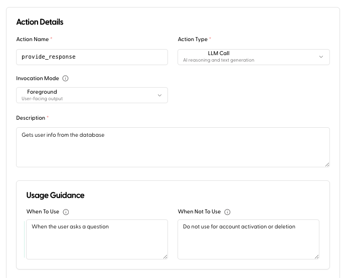 Use LLM Actions for atomic tasks that require reasoning but don’t necessarily need a full, stateful subagent.- Summarization: Condensing a long session history or a document.